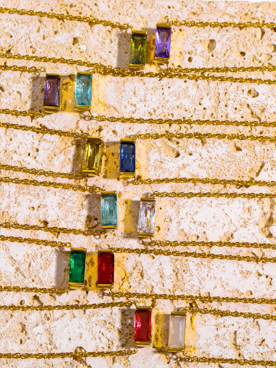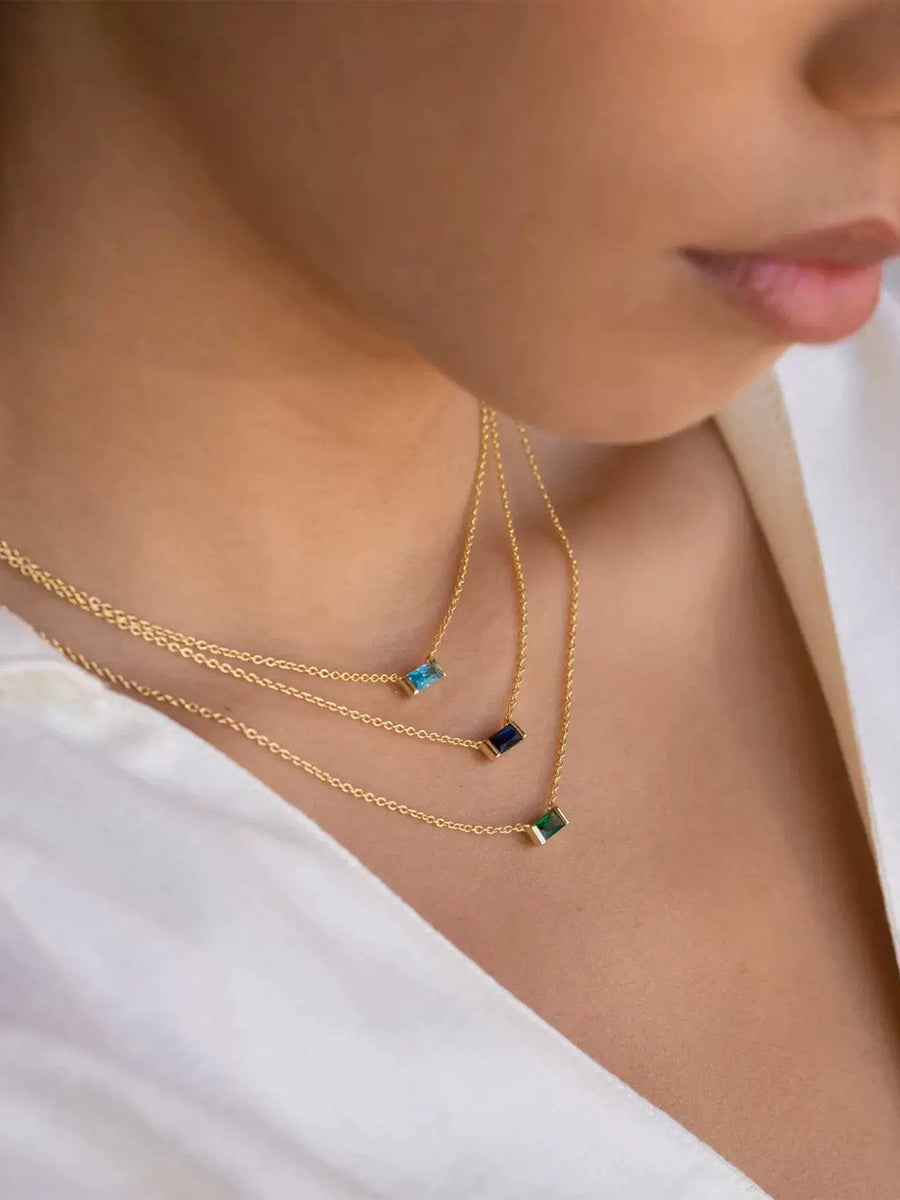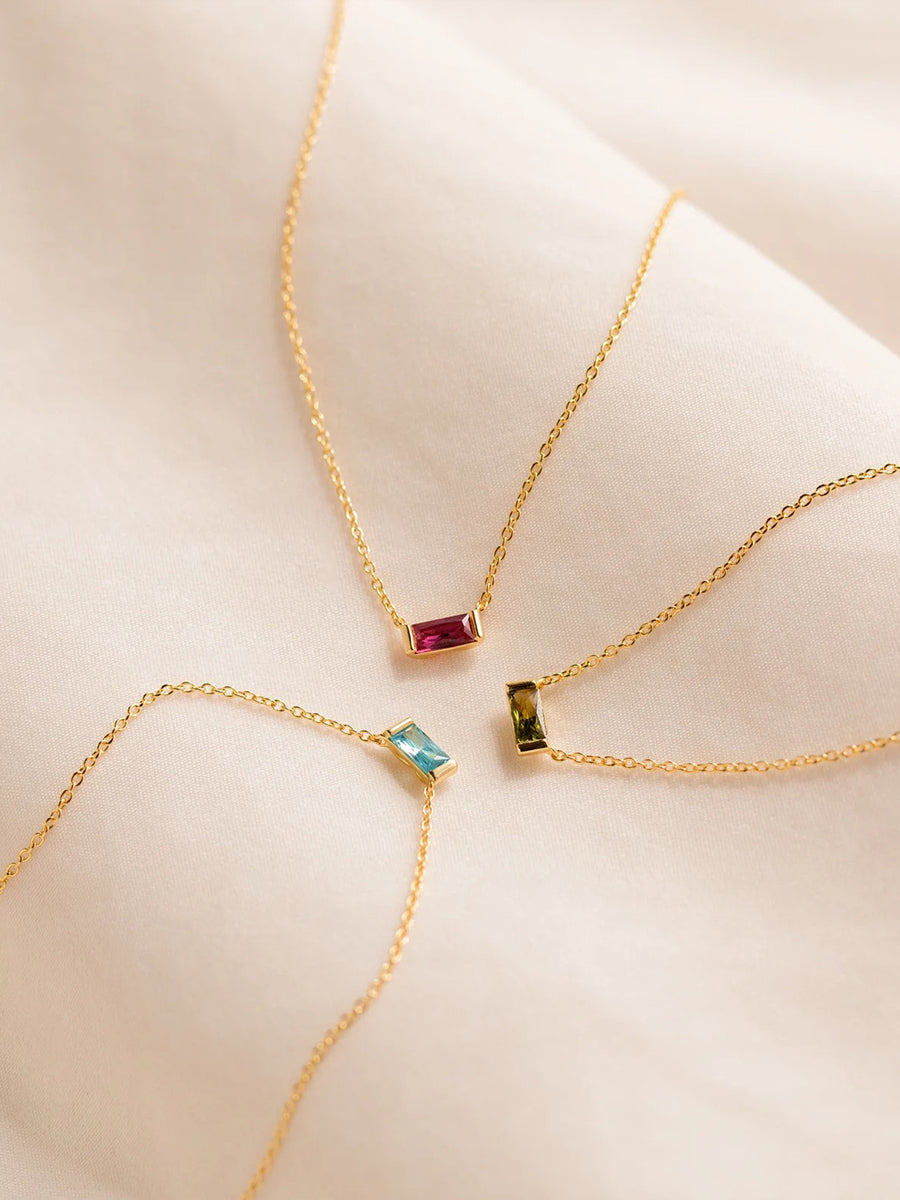 The Aurora Birthstone Necklace captures your individuality in a refined, modern design. Each hand-set baguette gemstone represents a birth month, bringing a touch of brilliance and symbolism to your everyday style. Paired with a delicate gold chain, this piece is versatile, gift-worthy, and designed to shine for years to come.
