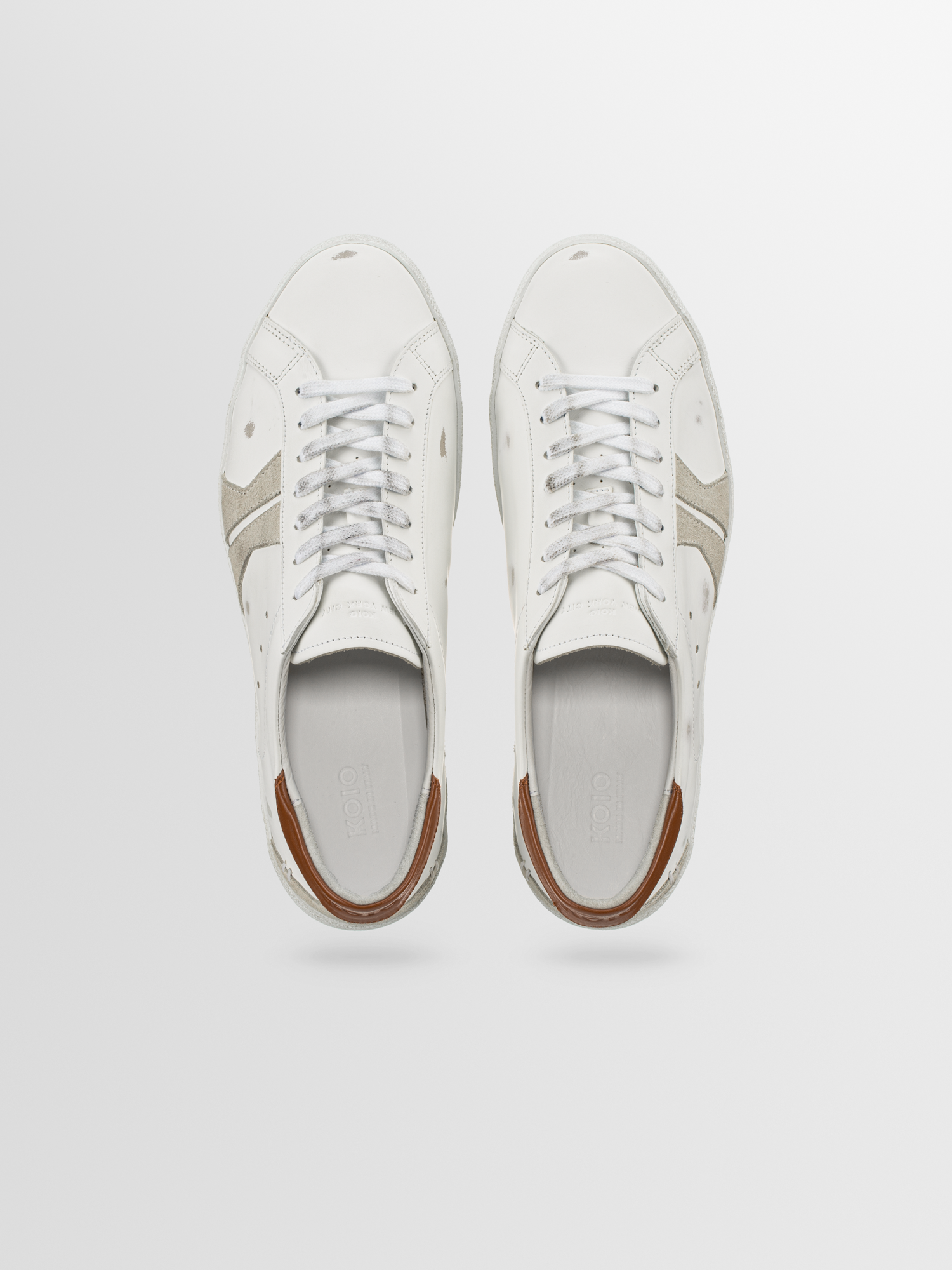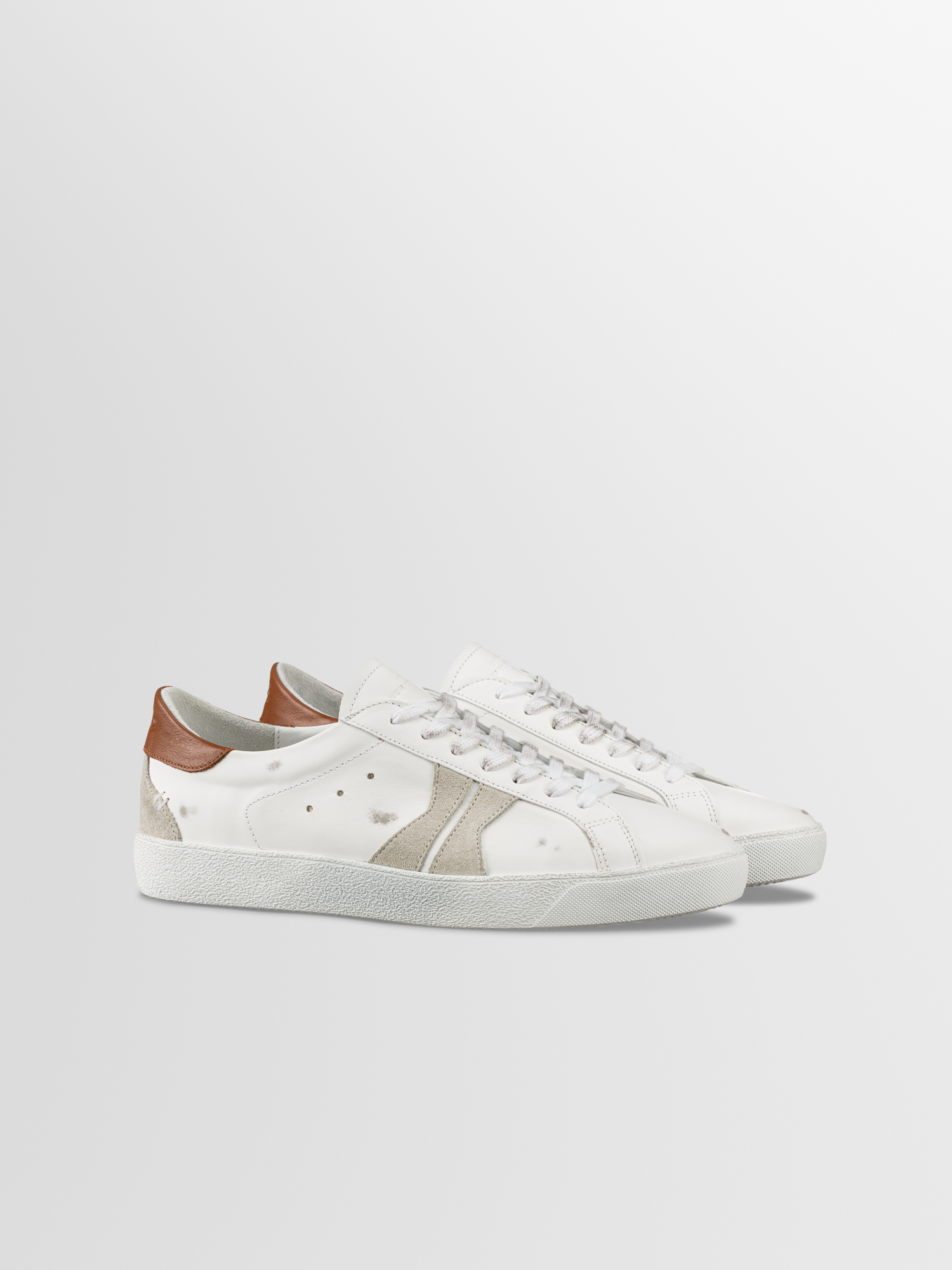 The Fabro sneaker is hand-distressed, so each pair has a uniquely authentic vintage look. Shown here in a white, grey, and brown Cinnamon colorway, this pair is handcrafted in Italy from Italian leather and suede. It's detailed with our signature K logo at the side and finished with hand-stitching at the heel. The breathable cotton-terry lining keeps you cool and comfortable.