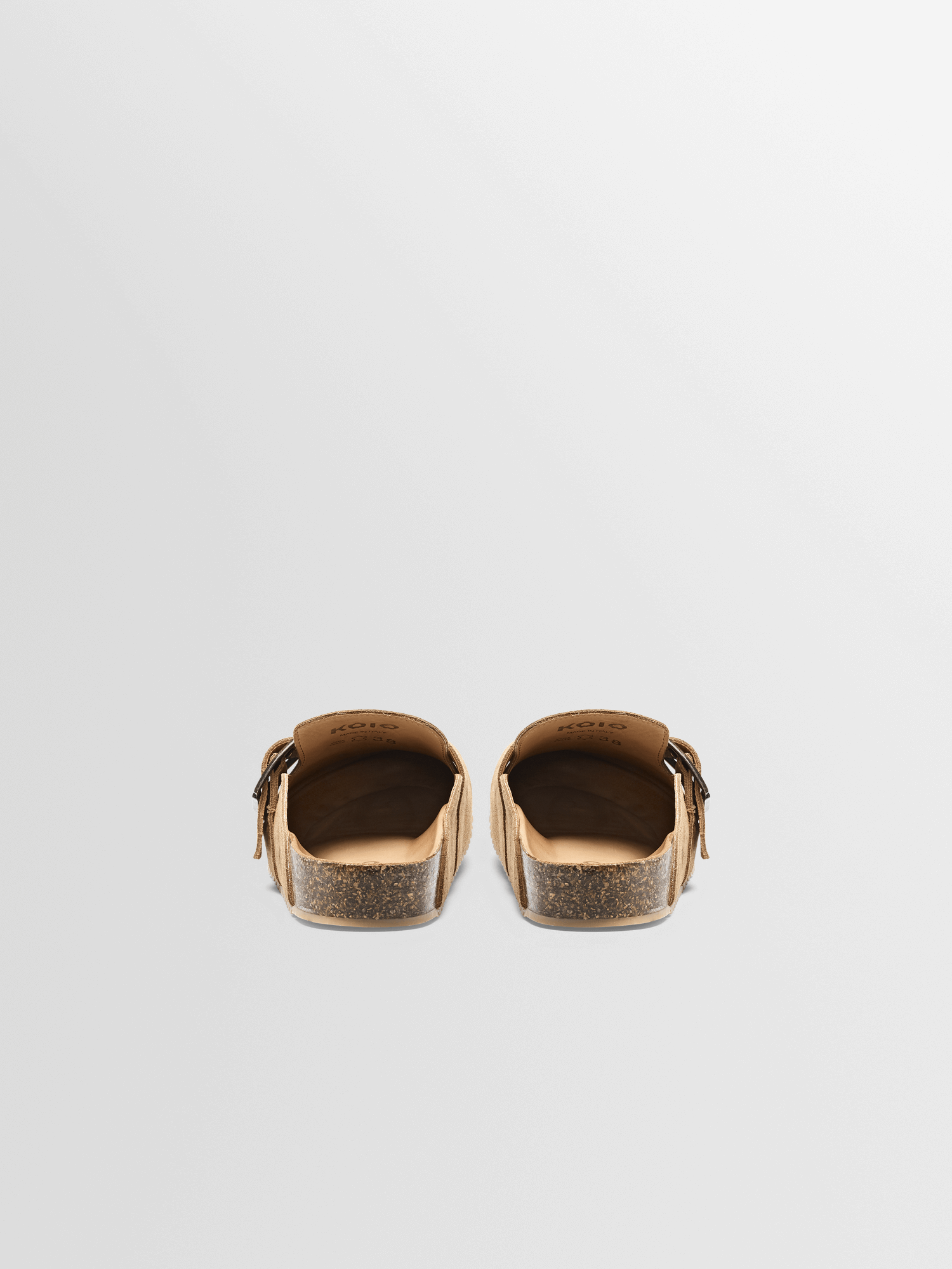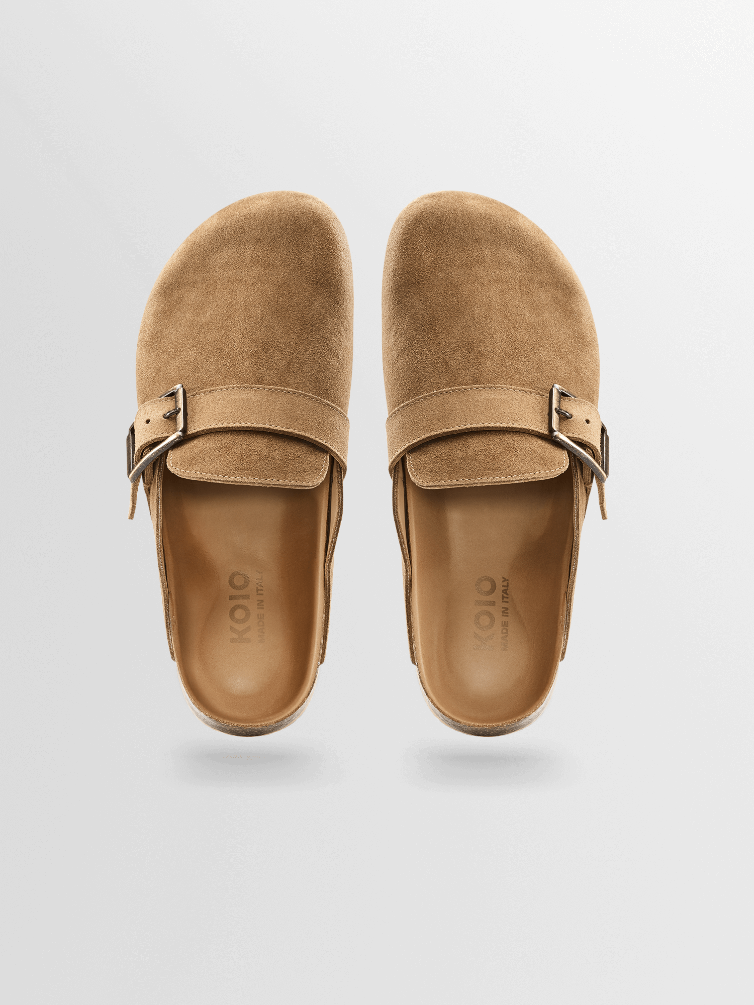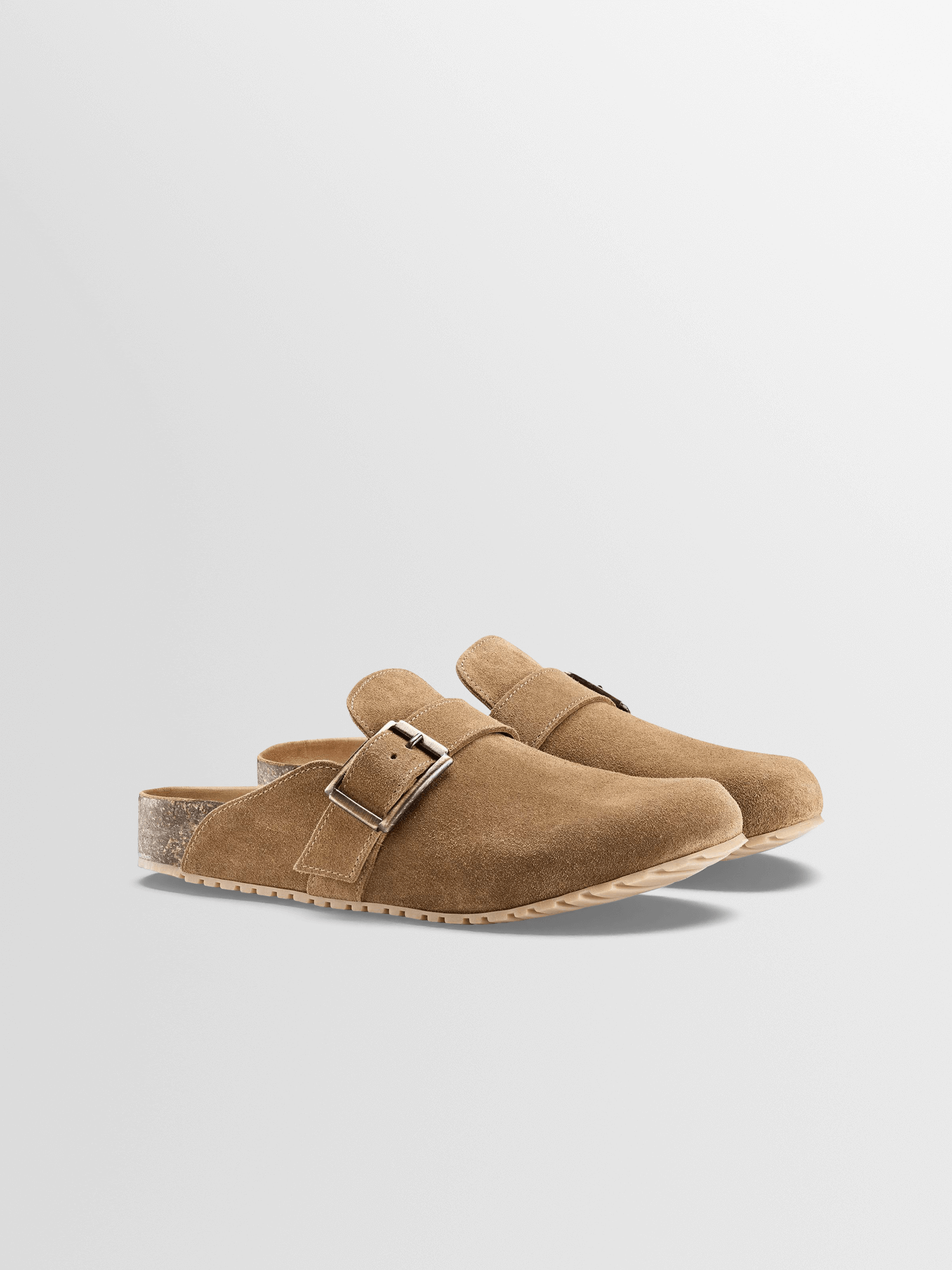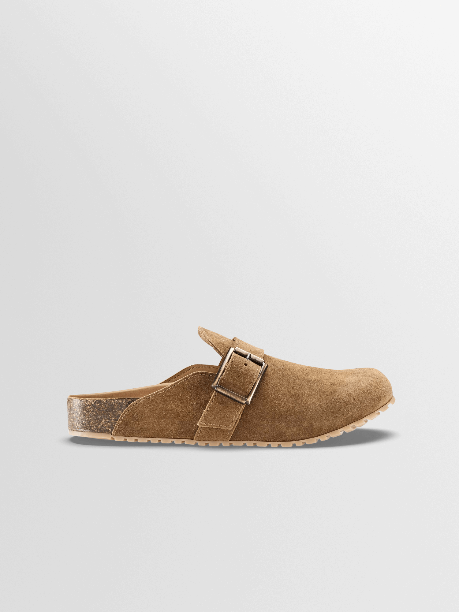 The Fuori is effortlessly cool and luxuriously comfortable, just as your everyday clog should be. Handcrafted in Italy from soft Cognac suede and lined with smooth leather, this slip-on style is fitted with a cushioned footbed and set on a cork midsole that molds to your natural shape over time. Adjust the brass buckle for a personalized fit.