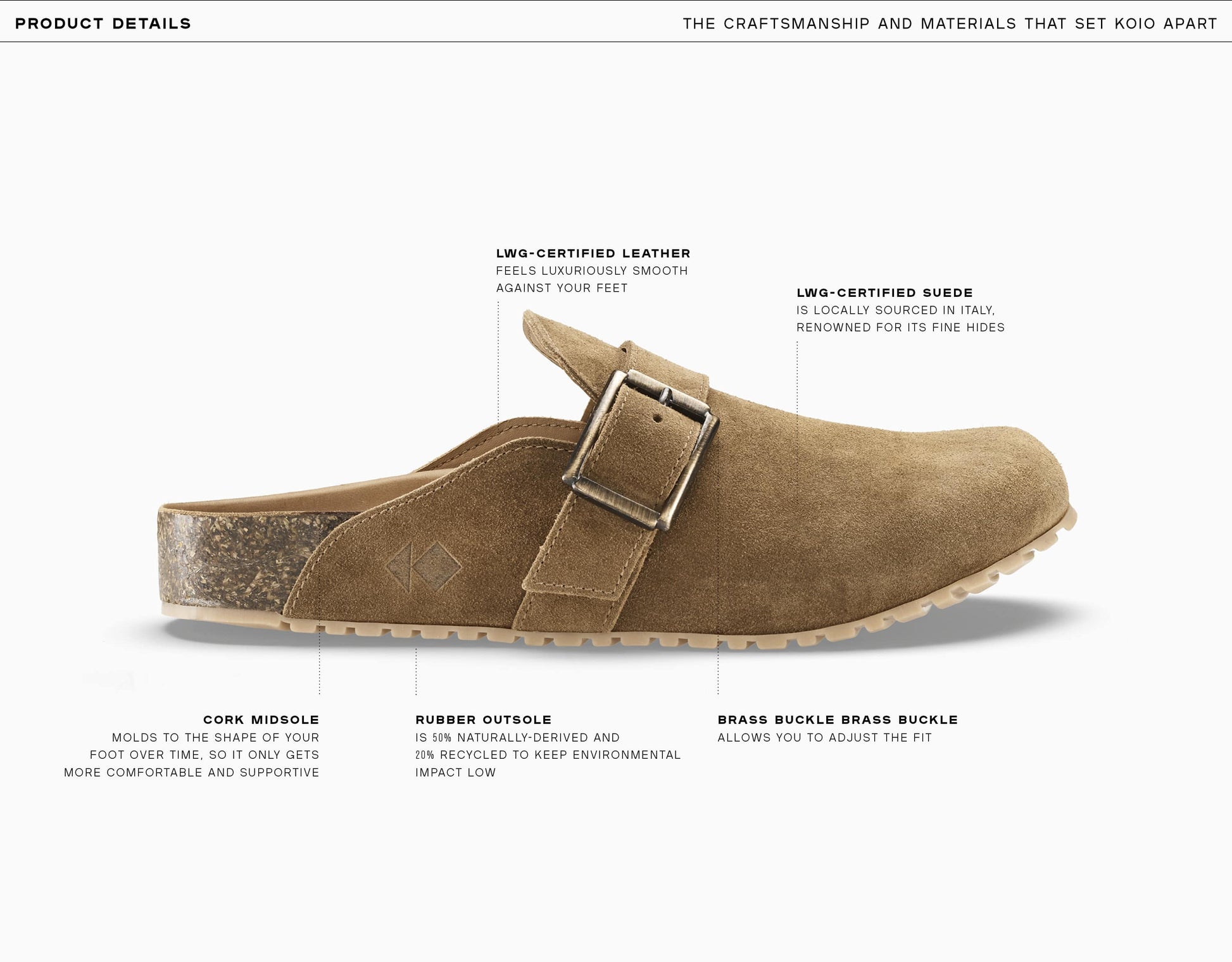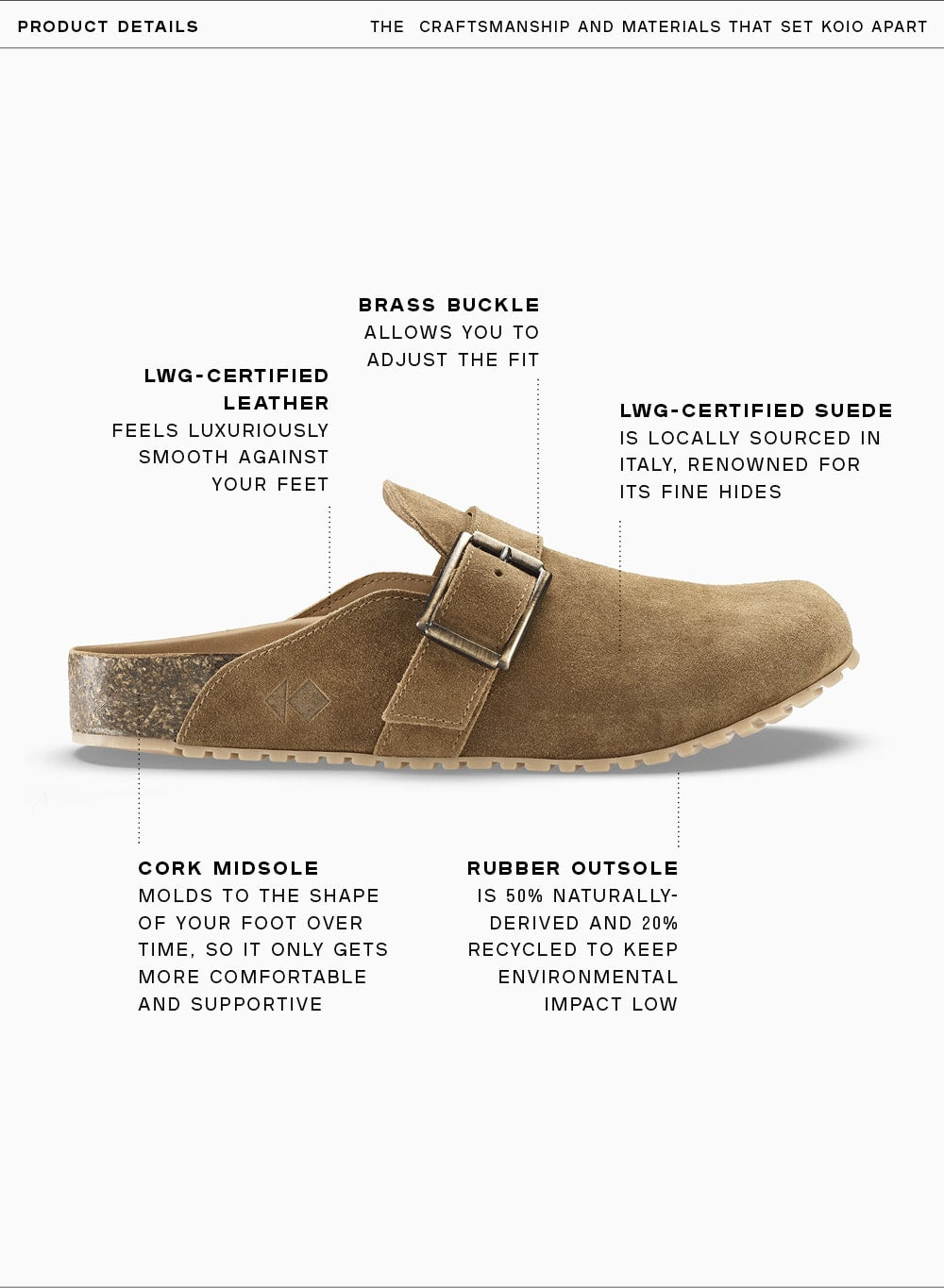 LWG Silver-certified suede & leather: This clog is made from suedes and leathers that are Silver-certified by the Leather Working Group (LWG), meaning they’re responsibly tanned in facilities that safely and carefully manage emissions, energy and water consumption, and waste.