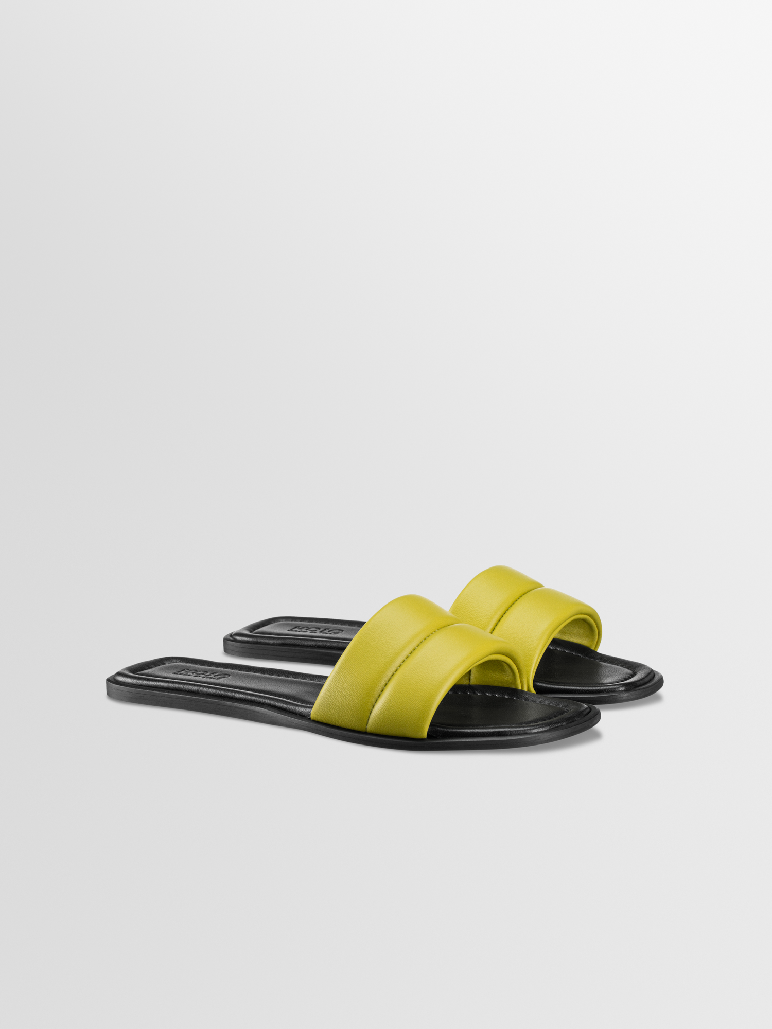 The Poppi mule is elegant yet comfortable, making it perfect for everyday wear during the warmer months. Shown here in vivid Citron Italian leather, it has a comfortable padded strap and flat square-toe silhouette with a cushioned insole.