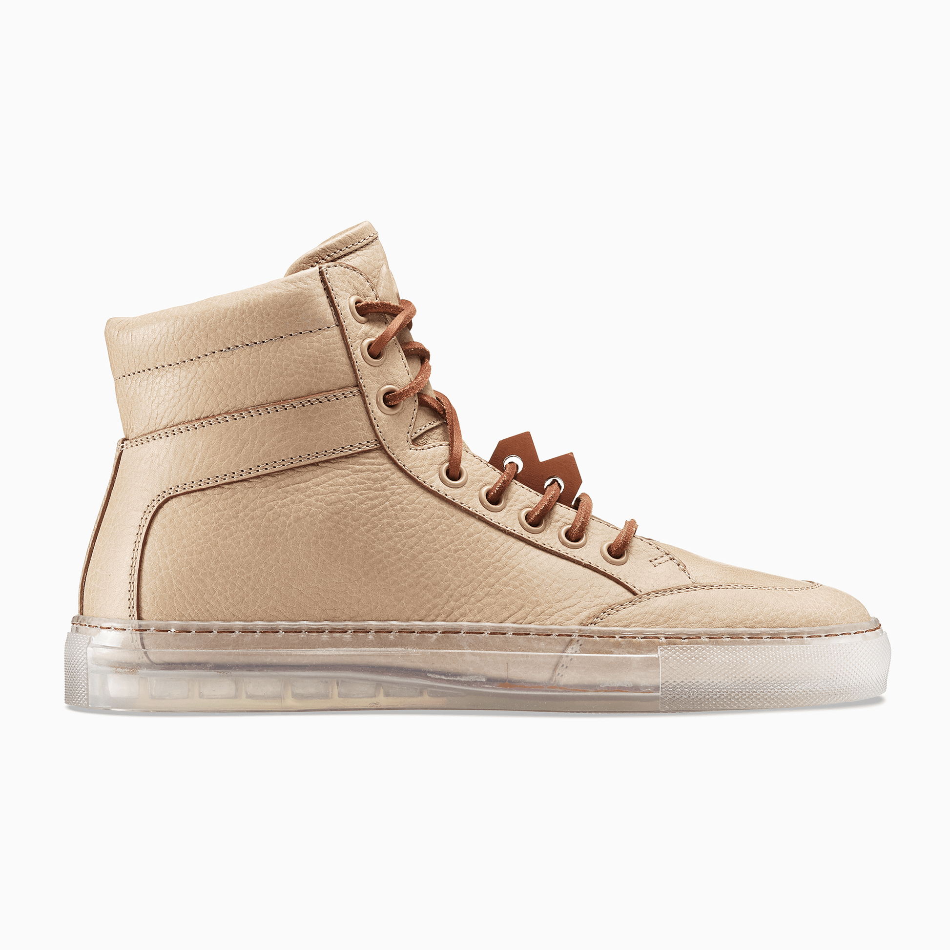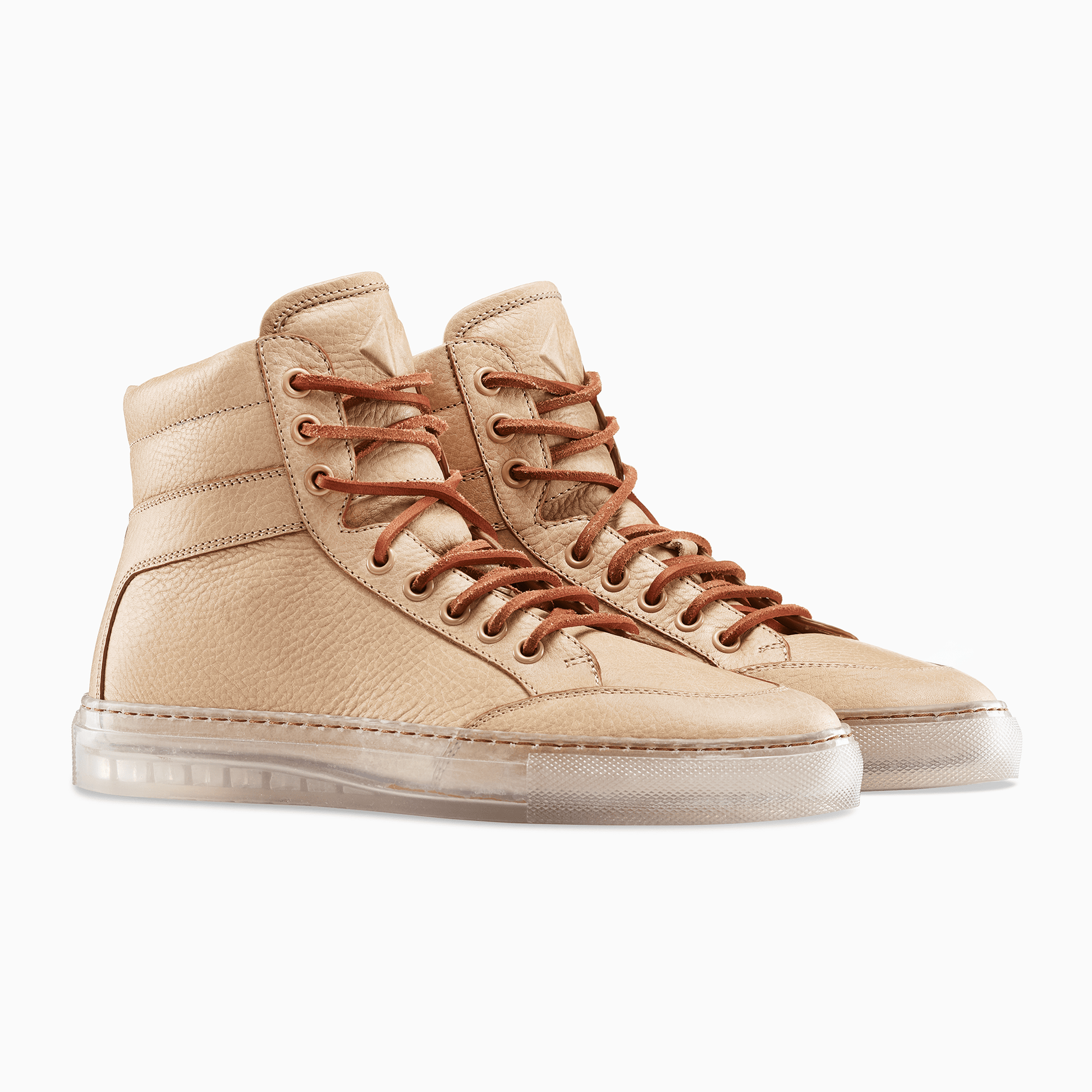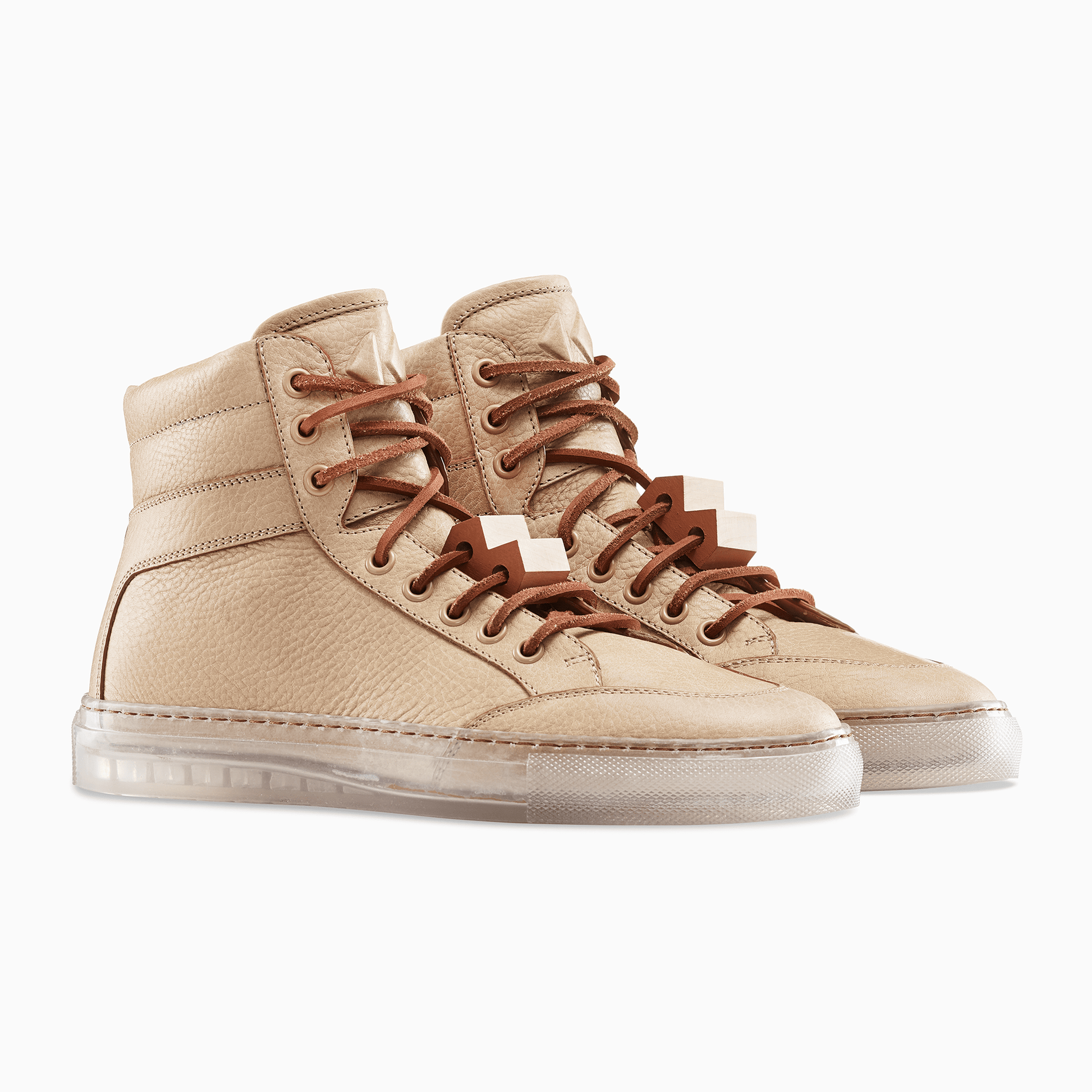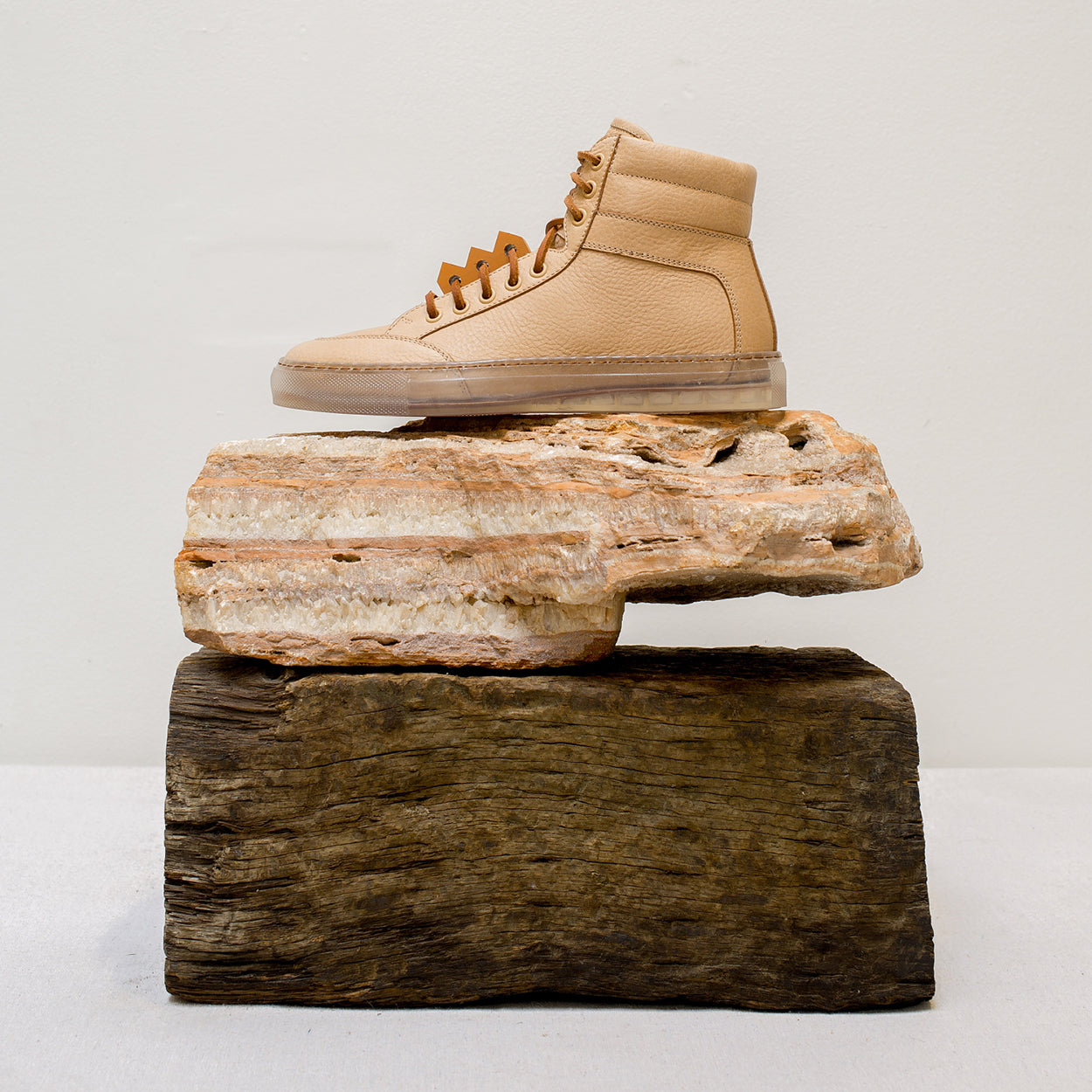 The Koio x Bradley Duncan is a collaboration with the L.A.-based sculpture artist. Bradley is renowned for his simplified geometric forms crafted from organic materials. His refined expressions demonstrate the enormous strength of both minimalist tradition and time-honored craftsmanship. In a similar vein is the Primo, featuring a transparent sole, leather laces, light brown pebble leather, plus an original Bradley Duncan WAVEFORM included on the upper that is removable.